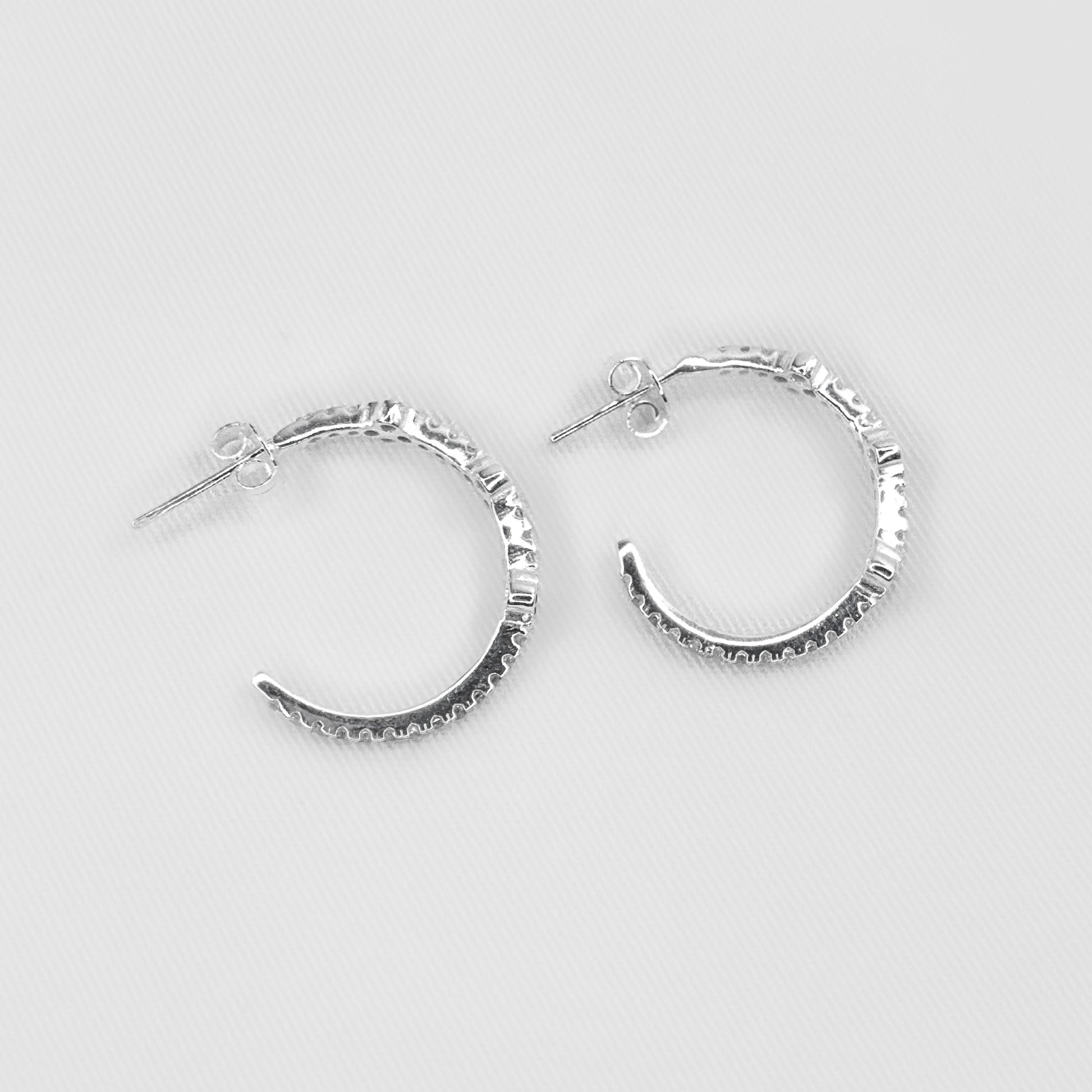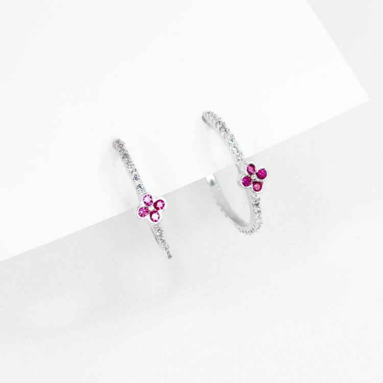 Argola super elegante e jovial, com fecho de tarraxa e cravejada com zircônias, contendo um trevo de zircônia rosa.