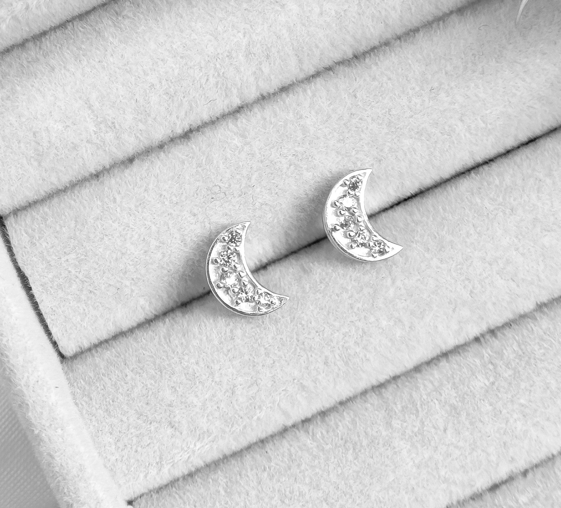 Brinco pequeno com mini lua cravejada, bem delicado e minimalista.